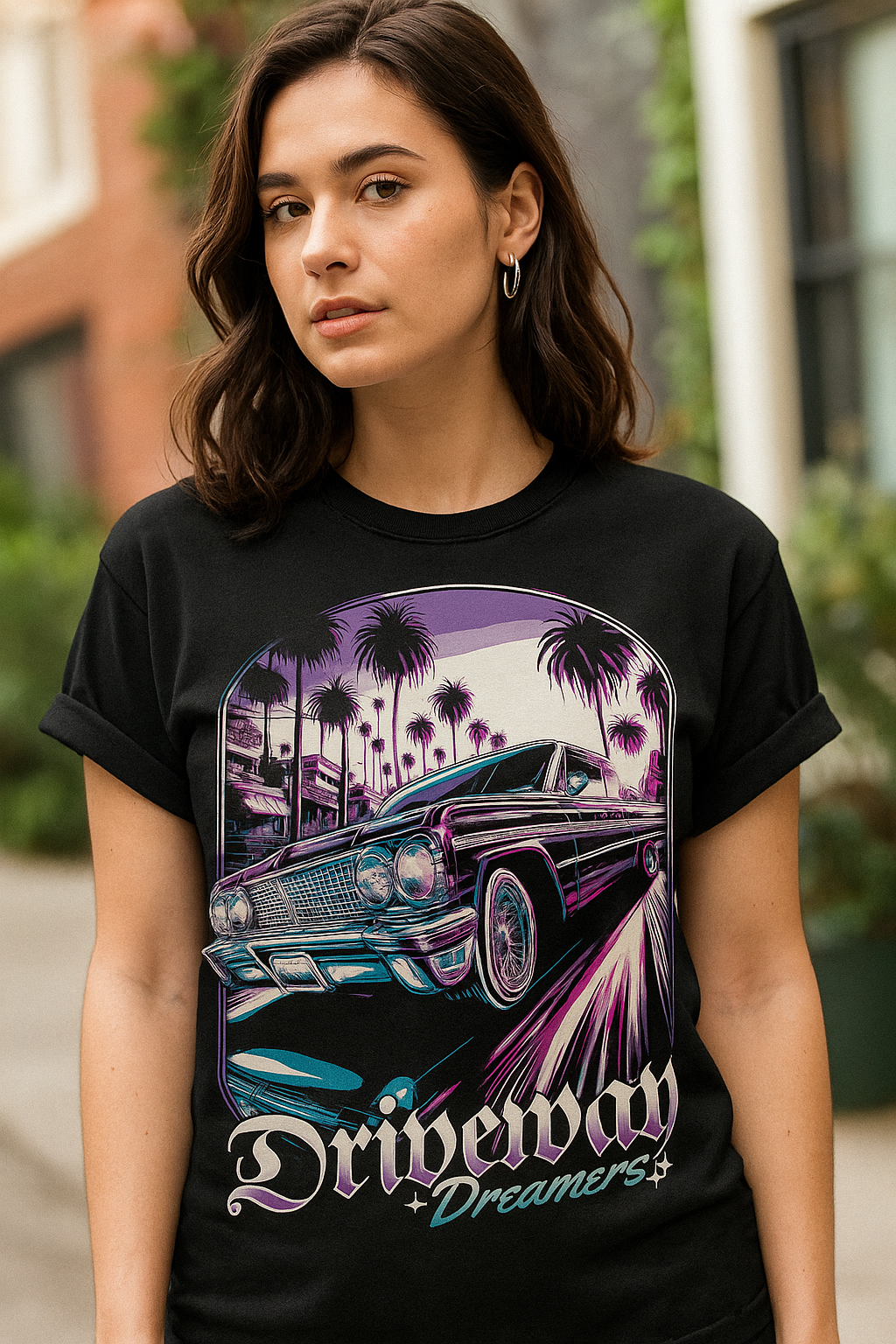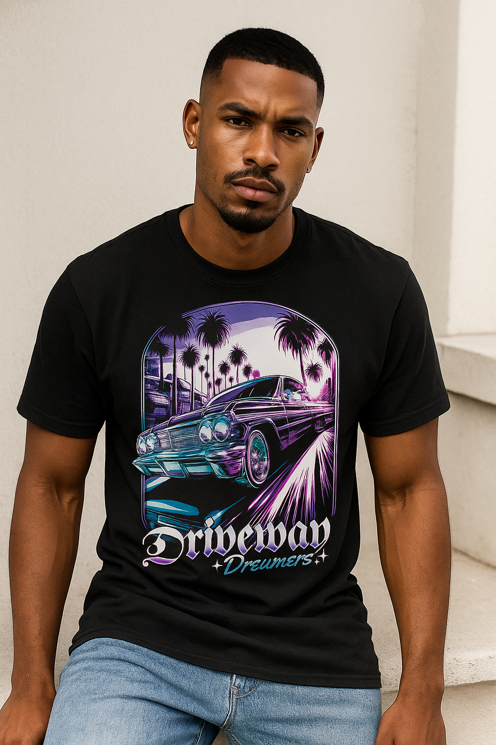Driveway Dreamers is a bold and nostalgic tribute to the golden age of lowriders, palm trees, and neon sunsets. Featuring a detailed vintage car cruising through a palm-lined boulevard with a glowing purple and magenta sky, this graphic captures the essence of Southern California car culture and street dreams. Perfect for car lovers, lowrider enthusiasts, and dreamers who live life in the fast lane—this design is made to turn heads and spark conversations.